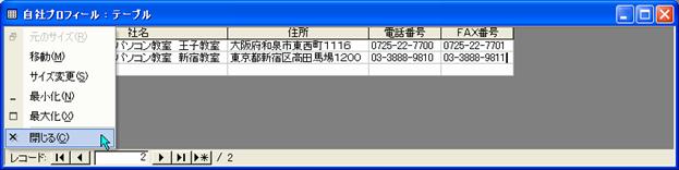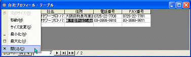 以上の操作で変更が保存され、データベースウィンドウに戻ります。なお、図1.175アのようにテーブルのアイコンをクリックしてコントロールメニューを表示し、[閉じる]をクリックしても(同図イ)、同じように変更した結果を保存できます。