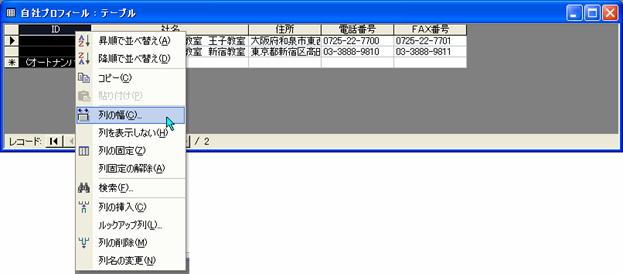 フィールドの表示幅をドラッグして変更する方法では、変更後のようすを見ながら操作ができますが、細かい調整はできません。フィールドの表示幅を数値で指定したり、入力データに合わせて自動的に調整することもできます。表示幅は文字数(半角文字数)で指定します。