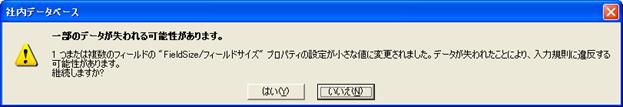 フィールドサイズに、すでに設定されている入力文字数より少ない値を設定すると、変更の保存時にデータの一部が失われることを知らせるダイアログボックスが表示されます。ここで[はい]を選択すると、データの後ろの部分が削除されてしまいます。