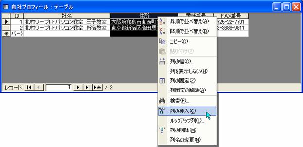 フィールドの追加は、データシートビュー、デザインビューのどちらでも行うことができます。データシートビューでは[列の挿入]、デザインビューでは[行の挿入]として行いますが、どちらでも結果は同じです。ここでは、データシートビューで新しいフィールド「都道府県」を、デザインビューでフィールド「郵便番号」を追加する操作を解説します。