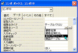 ウィンドウを使わずに挿入した下側のコンボボックスを例に操作します。コンボボックスに表示するテーブルは、プロパティ[値集合ソース]で指定します。