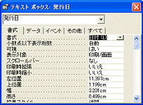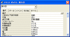 テキストボックスを適切な場所に挿入して、プロパティ[書式]を[日付]に設定します。テキストボックス名は「発行日」にしておきます。