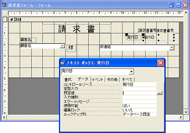 請求書フォームをデザインビューで開いて、関数を入力するテキストボックスのプロパティウィンドウを表示して操作します。