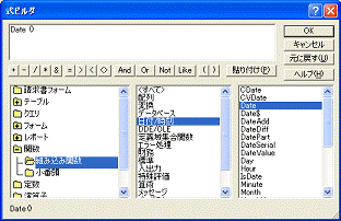 挿入した関数の先頭に「=」が自動的に入力されます。式であることを示すために先頭に=が必要なのですが、式ビルダを使った場合は入力を省略できます。また、式ビルダに表示される関数一覧には関数名として「Date」とだけ表示されていますが、貼り付けると「Date()」のように必要なカッコが付加されます。