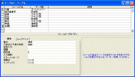 請求明細を記録するマスターテーブルを作ります。テーブル作成の詳細はすでにPart1で解説してあるので、フィールドの一覧だけを示しておきます(図2.183)。各フィールドのプロパティは図2.184〜図2.191のようにしてあります。