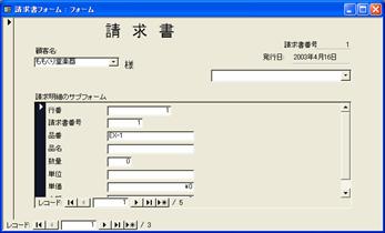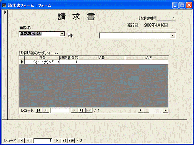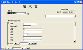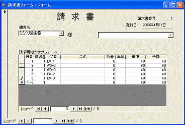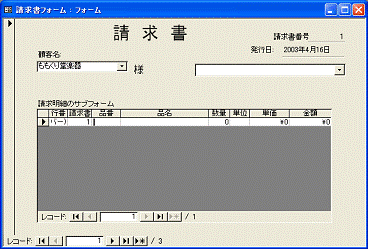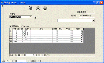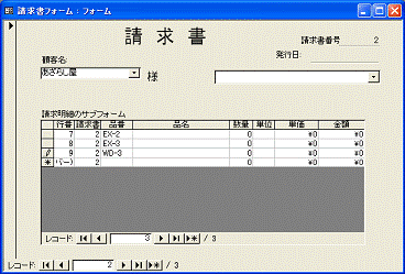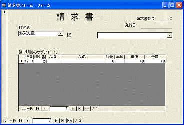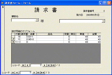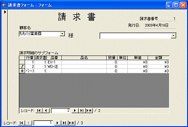 1枚目から2枚目へと、次の請求書を表示するには、親フォームのレコードボタンをクリックします。1枚目を入力して2枚目に進むと、1枚目で入力した請求明細は消えて、2枚目の請求明細の一覧が表示されます。