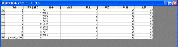 請求明細の行番はすべて請求明細の入力順に振られる連番で、請求書ごとに1から始まる番号ではありません。このようすは、請求明細(マスター)テーブルを開くと確認できます。