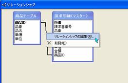 この動作を実現するには、問い合わせ側のテーブル(ここでは請求明細(マスター)テーブル)と、回答を送る側のテーブル(商品テーブル)にリレーションシップを設定し、問い合わせ側に回答を受け取る窓口を作ることが必要です。