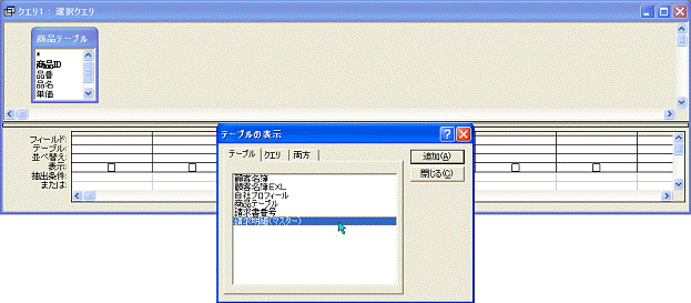 B目的のテーブル名を選択する(ここでは「商品テーブル」)