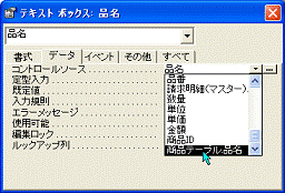 商品IDを入力すると品名が自動的に表示されるようになりましたが、品名との対応がわからないと入力しにくいので、これを解決するためにコントロールソースはフィールド[商品ID]のままにして、表示は品番になるように変更します。