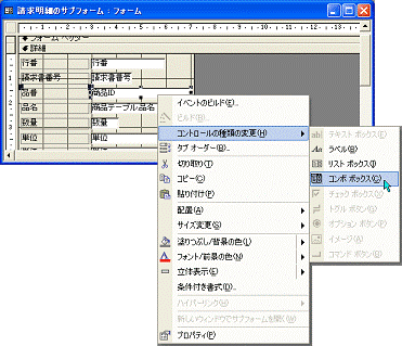請求明細のサブフォームのデザインビューに戻り、テキストボックス[品名]を右クリックしてショートカットメニューの[プロパティ]を選択します。