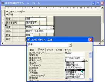 品番を入力して品名を表示したのと同じ方法で、単位と単価を自動表示させます。リレーションシップの設定も同じですから、新たに設定する必要はありません。クエリ「請求明細クエリ」にフィールドを追加し、サブフォームのコントロールソースを変更するだけです。これまで解説した操作の応用操作でサブフォームを完成できるので、ここでは操作と結果だけを示しておきます。