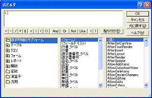 ■式ビルダ コントロールソースなどに入力する計算式などを作成するために使う機能。フィールド名やテーブル名、あるいは関数をマウスで選択操作し、目的の数式を完成させることができる