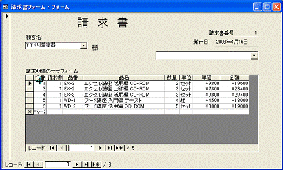 長い説明になりましたが、請求書らしいフォームが完成しました。ここでは品番と品名を例に操作を解説しましたが、同様の操作で親フォーム上に顧客名を入力して、顧客住所や電話番号を自動表示させることもできます。ページ数の関係ですべての操作を解説できませんが、読者が自分で設定すると理解が深まることと思います。ぜひ挑戦してみてください。次節以降は、ここまでの操作の続きとして解説を進めます。