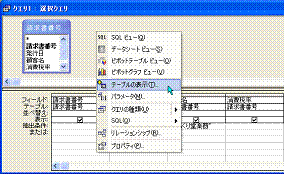 請求明細を表示して、最終的な目的である請求金額の合計計算の準備をしておきます。請求明細は請求明細(マスター)テーブルに記録されています。したがって、クエリに請求明細(マスター)テーブルを追加します。